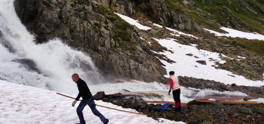 In der Nacht hat es stark geregnet und gewittert. Heute ist unser letzter Arbeitstag. Ernst und Martin machen sich auf, um die Wegmarkierung über die Langtalseen zu überprüfen und eventuell zu erneuern. Ralf, Livia und Klaus-Dieter gehen zum Wasserkraftwerk und bergen hier Holzplatten, die vom Wasser freigespült sind. Dazu muss Ralf in den Bach steigen.