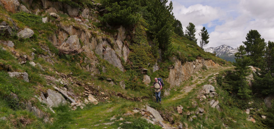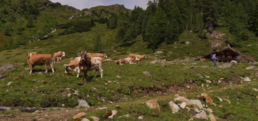 Vom Wirt der Pension Bäuerle werden wir bis zur Wirtbaueralm mit dem Wagen hochgefahren. Ein beschwerliches Stück Weg, das wir nicht gehen müssen. Vom Parkplatz aus gehen Ralf und Martin voraus, während Klaus-Dieter und ich es langsamer angehen lassen. Bis zur Hütte – Höhe 2346 m – muss eine Vielzahl von Bächen überquert werden. Auf dem Weg macht Klaus-Dieter eine Reihe von Fotos. Gegen 16:00 Uhr kommen wir an und werden von Lukas, dem Sohn des Hüttenwirts, begrüßt, da Herbert selbst nicht auf der Hütte ist.