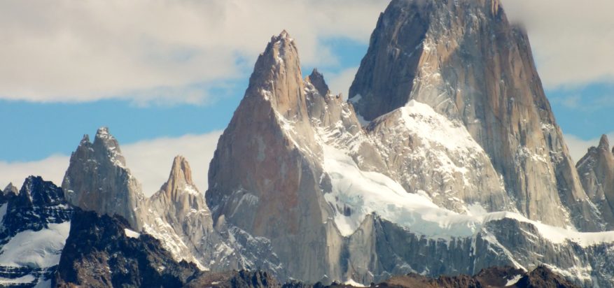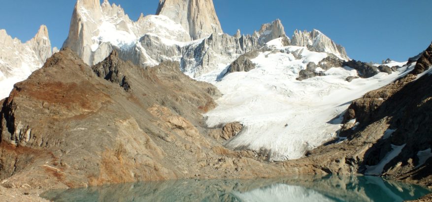 Nach fast dreiunddreißig Stunden Anreise erreichten wir (mein Mann Gerd, Hilde, eine Kletterfreundin, und ich) endlich El Calafate, einen Ort, der vollkommen unbekannt und noch viel kleiner wäre, wenn er nicht am Rande des Nationalparks Los Glaciares im Süden Argentiniens liegen würde. Cerro Torre und Fitz Roy waren unsere Sehnsuchtsziele. Wir wollten diese Berge unbedingt sehen und bereits auf der Fahrt nach El Chaltén, dem Ausgangsort unseres viertägigen Trekkings, konnten wir sie bei blauem Himmel bestaunen.