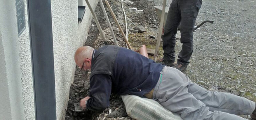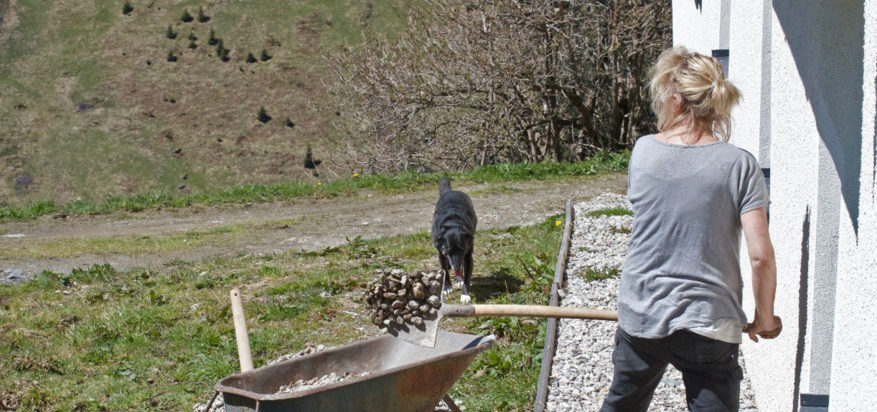 Heute Nacht hat es geschneit. Alles ist weiß und es schneit noch immer. Ans Streichen ist gar nicht zu denken. Da wir nicht wissen, bis zu welcher Höhe der Sockelanstrich erfolgen soll, nehme ich Rücksprache mit der Architektin. Von ihr erfahre ich, dass das Kiesbett rund um die Hütte ausgehoben werden muss, da der Sockelanstrich auch im Erdreich erfolgen muss, damit die Feuchtigkeit nicht im Putz aufsteigen kann und die Isolierung beschädigt.