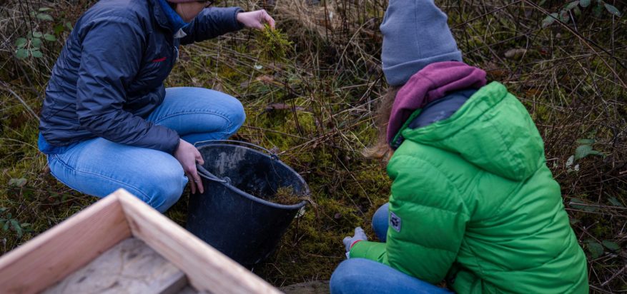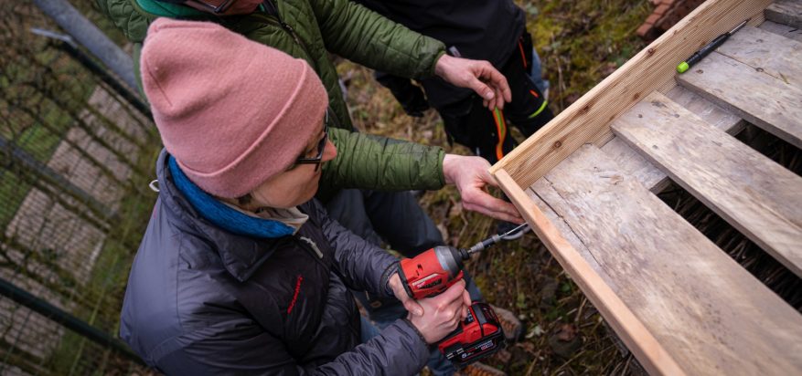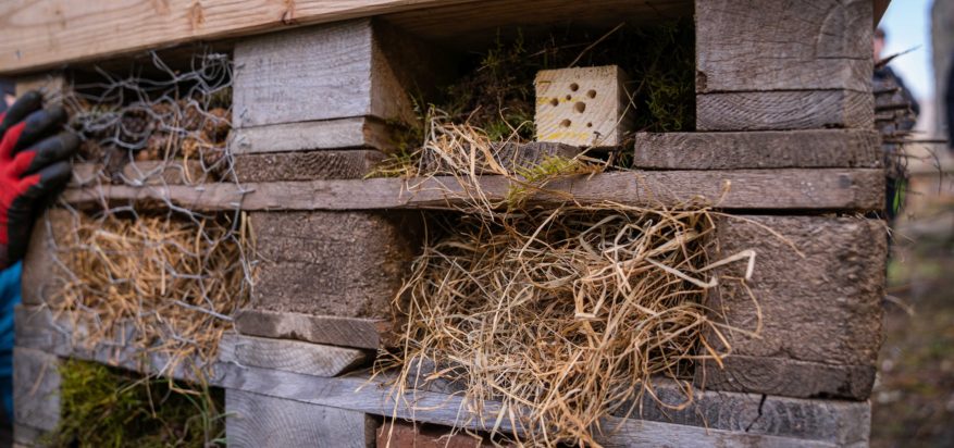 Das Grundgerüst wurde aus alten Europaletten gebaut. Die Zwischenräume wurden mit Holz, Heu, Moos und Zweigen vollgestopft. Auf dem Palettenstapel wurde eine kleine Umrandung gebaut, sodass sich darauf Gräser und Kräuter aussähen können. Alle arbeiteten fleißig mit Akkuschrauber, Säge und Bohrer und das Ergebnis kann sich sehen lassen.